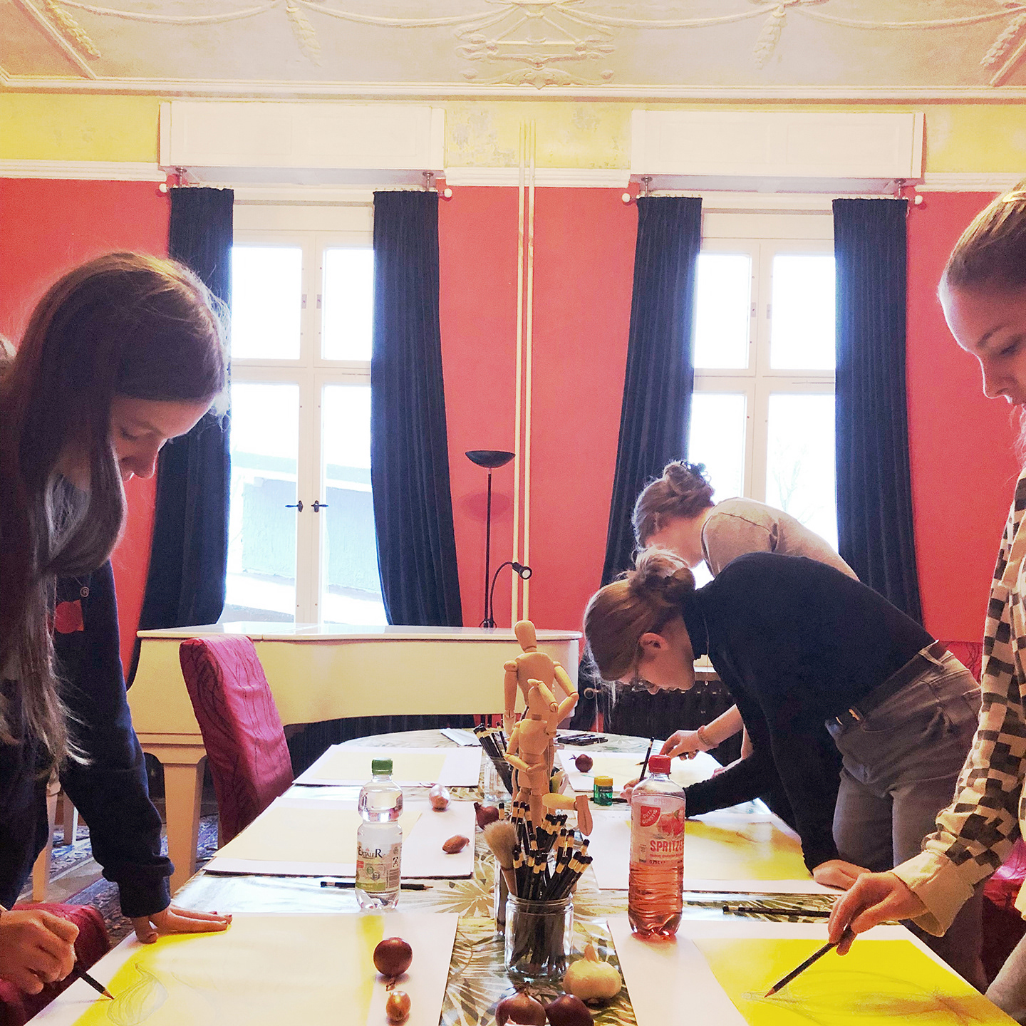 Unter der professionellen Anleitung der Künstlerin und Designerin Dorit Goedecke werden Zeichentechniken auf der Grundlage bildnerischer Gestaltung vermittelt und die Reduktion eingeübt – eine wichtige Komponente in der Kunst.